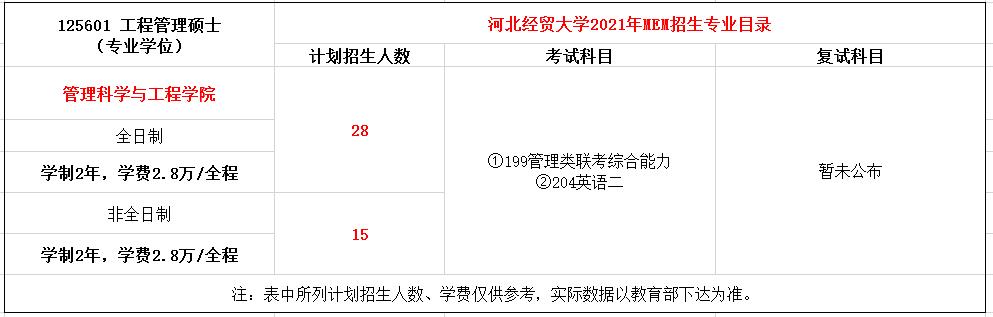 河北经贸大学2021年MEM工程管理硕士(125601)管理科学与工程学院全日制招生28人,学制2年,学费2.8万/全程;非全日制招生15人,学制2年,学费2.8万/全程。