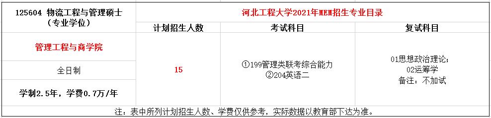 河北工程大学2021年MEM物流工程与管理硕士(125604)全日制招生15人,学制2.5年,学费0.7万/年。