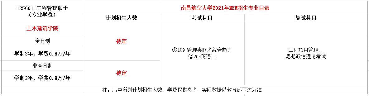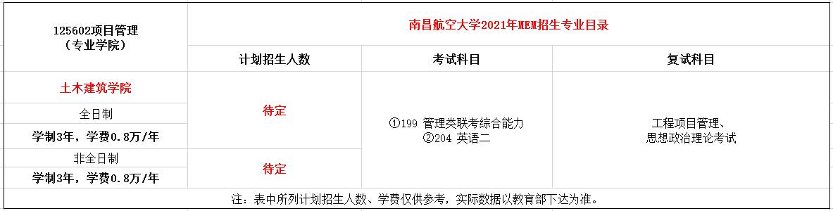 南昌航空大学2021年MEM(125601、125602)招生简章