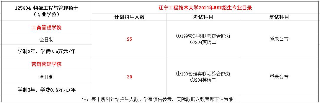辽宁工程技术大学2021年MEM物流工程与管理硕士(125604)工商管理学院全日制招生25人,学制3年,学费0.6万元/年;营销管理学院全日制招生30人,学制3年,学费0.6万元/年。