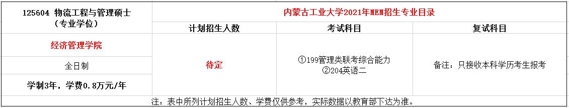 内蒙古工业大学2021年MEM物流工程与管理硕士(125604)经济管理学院招生人数待定,学制3年,学费0.8万/年。