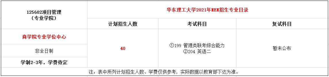 华东理工大学2021年MEM项目管理硕士(125602)商学院专业学位中心非全日制招生40人,学制2-3年,学费待定。